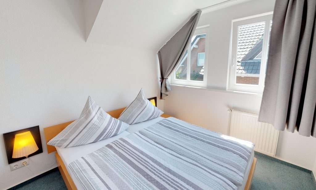 Das Schlafzimmer der Ferienwohnung verfügt über ein komfortables Doppelbett (160 x 200m) mit Komfortmatratzen. An jeder Seite des Bettes befindet sich eine Wand-Nachttischlampe, die am Abend sowohl Lesen als auch eine kuschelige Atmosphäre ermöglicht. Für das Aufladen von Handys oder E-Books stehen jeweils zwei Steckdosen neben dem Bett zur Verfügung. Der geräumige Kleiderschrank bietet ausreichend Stauraum für Kleidung zum Aufhängen und Falten. Zusätzlich sind genügend Kleiderbügel, ein langstieliger Schuhanzieher, ein Regenschirm und eine Kleider-Fusselrolle vorhanden. Die Fenster sind neben den Plissees mit Verdunklungsvorhängen ausgestattet, um Ihnen einen erholsamen Schlaf zu ermöglichen.