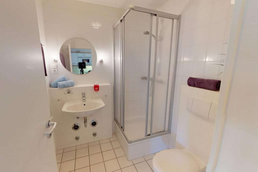 Das kompakte, innenliegende Bad mit Entlüftung ist funktional gestaltet und verfügt über eine Eck-Dusche, eine Toilette und ein Waschbecken. Eine Ablage bietet Platz für Kosmetikutensilien und ein beleuchteter Spiegel sorgt für die richtige Ausleuchtung. Ein Fön sowie Seife und eine Erstausstattung Toilettenpapier werden bereitgestellt.